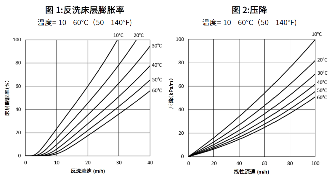 圖 1 為不同反洗流速和水溫下 杜邦AmberLite™ IRC76CRF H 的估計床層膨脹率。