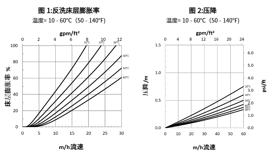 圖 1 為不同反洗流速和水溫下 杜邦AmberLite™ IRC120H 的估計床層膨脹率。